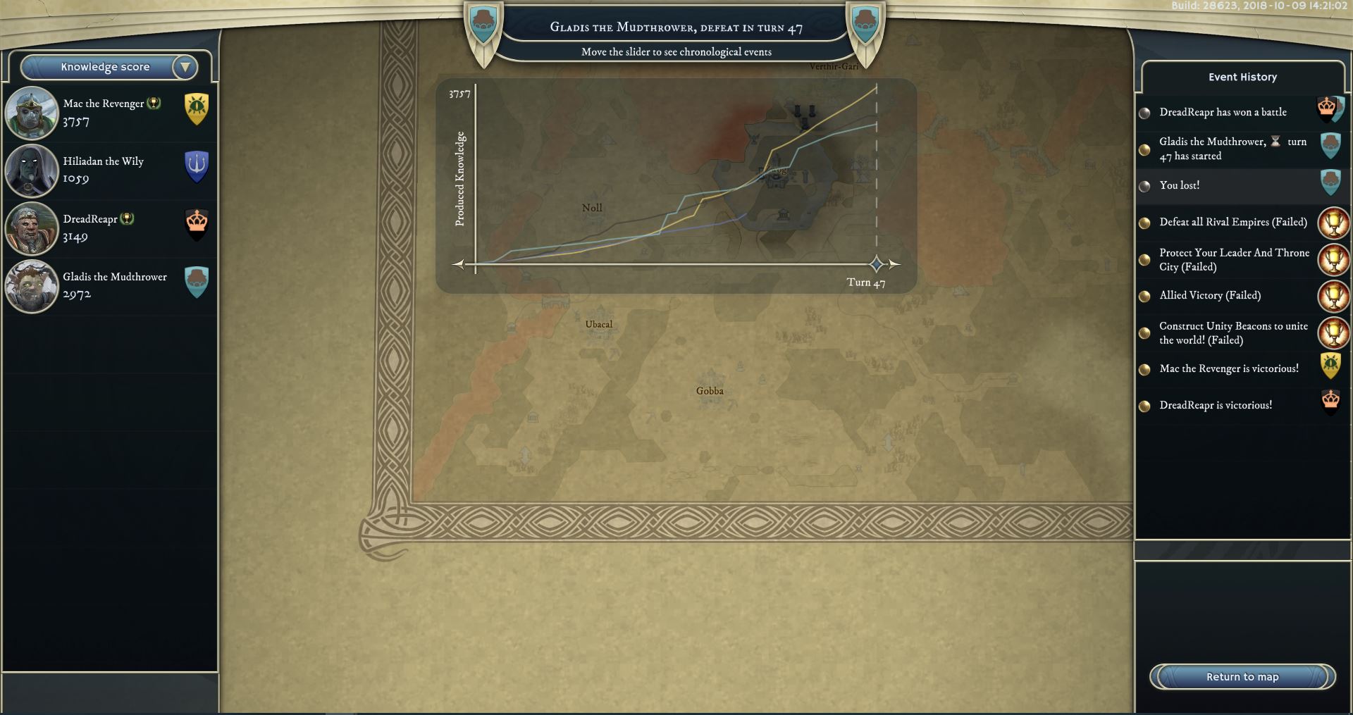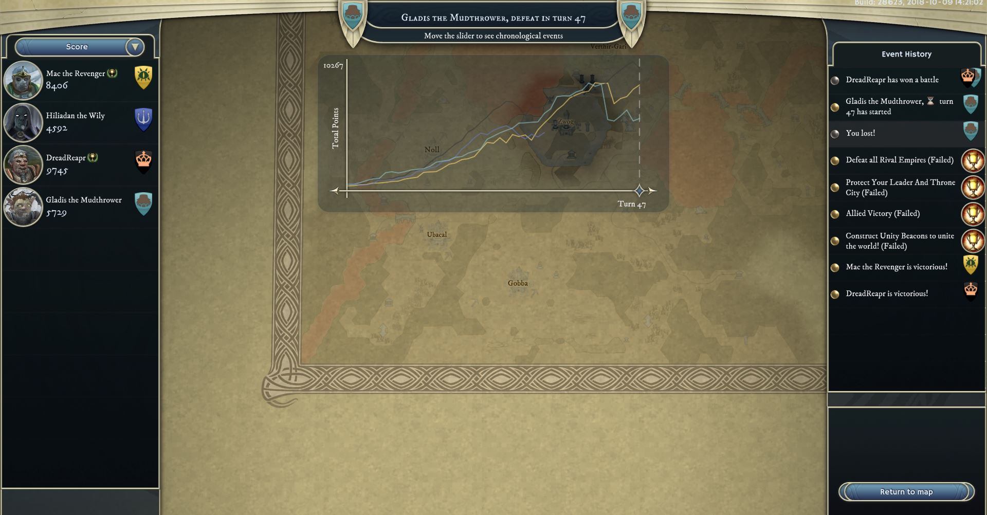 I wanted to write a longer report, but this game was quite straightforward, if you dont count Hiliadan sneaking up and taking 2 of my cities and destroying a fort. But by doing so he overextended and ultimately lost his leader and throne.