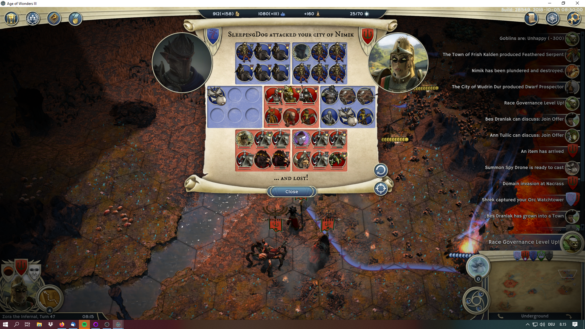 Two turns later Sleeping dog officially lost (though he didn't bother coming in game to check it, so the stupid turn timer kept expiring…), personians armies took the Undead dwelling, but his capital was razed, my sorc is wrecking havoc in his other cities now and thanks to all the plundering we are now a late game Warlord and Dreadnought swimming in resources with pumped up heroes against a lone theocrat with dwindling resources and armies approaching from pretty much everywhere.