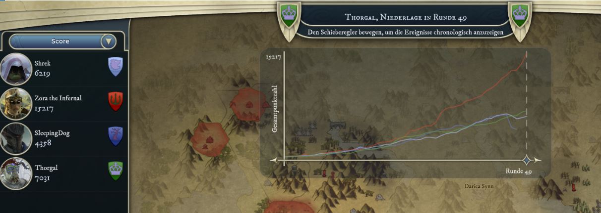Here are the points sent to the judges at the end of Thorgals turn. I'm actually quite surprised we did manage to keep up even in the domain score throughout the game, we were under the impression that we are quite a bit behind in that regard during the early to midgame, but apparently my underground activities and Thorgals undead dwelling made up for it