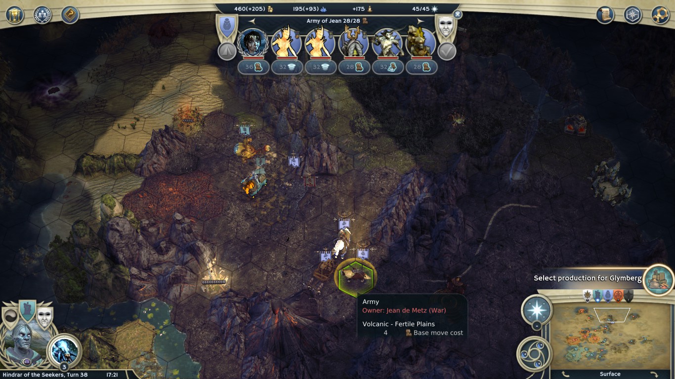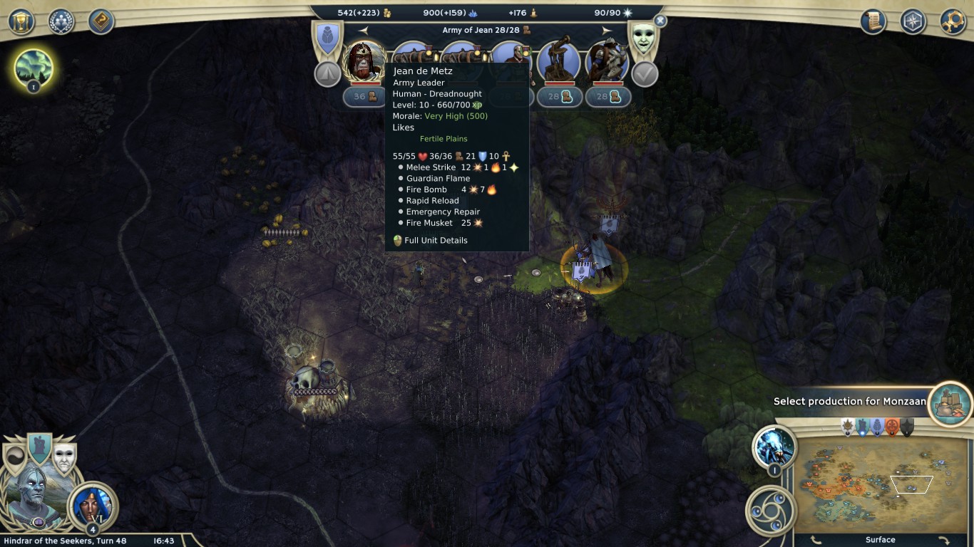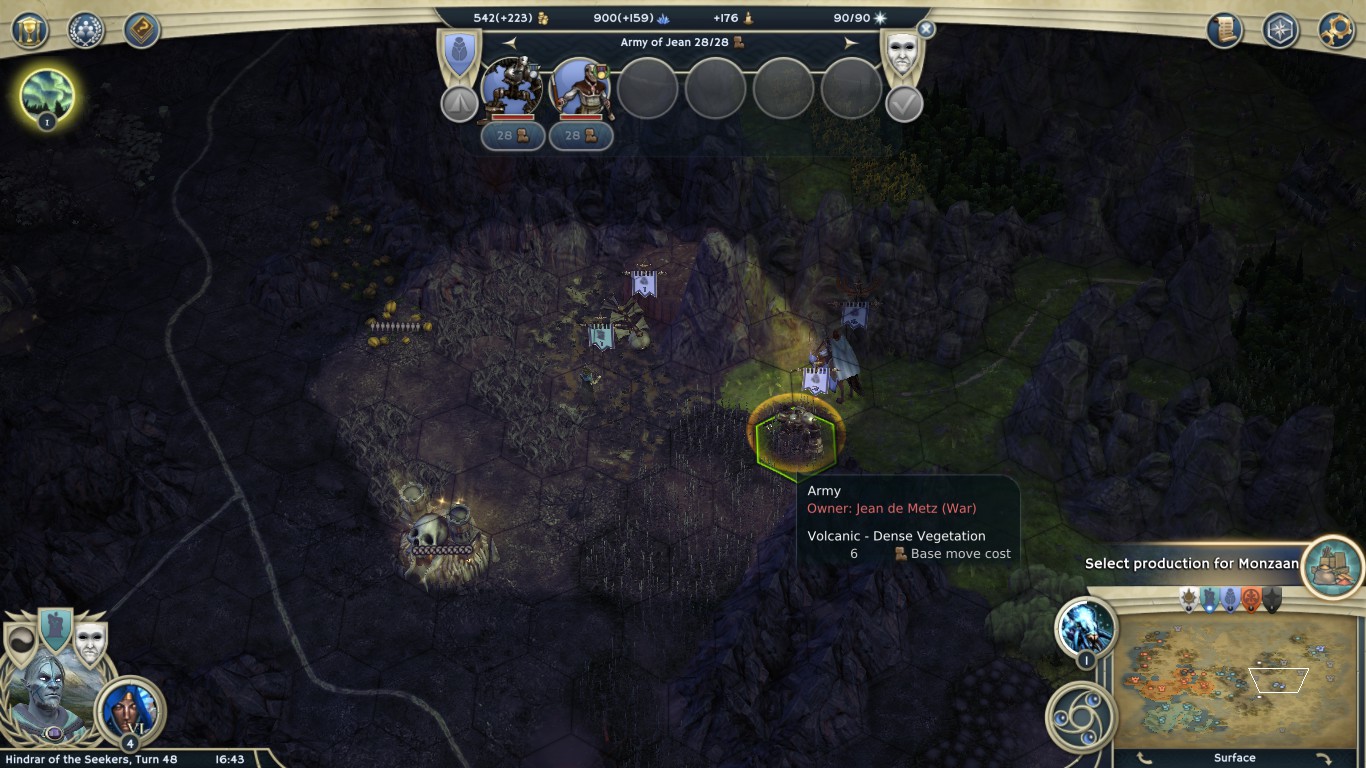 Instead I split my armies, because I got Invisibility on my leader, so tried to see if I can scoop in and take a few cities. Unfortunately for me, Jean had a surprisingly good defending army (lvl-ed Cannons, Engineers, and some Priests), and it could reach most of his cities within two turns. I could only take one of his newer and smaller cities. At this point I had a couple of Eldritch Horrors, and were to summon more, but Jean kept "draining" my leader's CPs off turn. While we were playing hide and seek, and CP management games he got some Obsidian Dragons out of the blue. I was certain I dealt with any support that could see my invisible army as I was making my way out, but I was wrong.