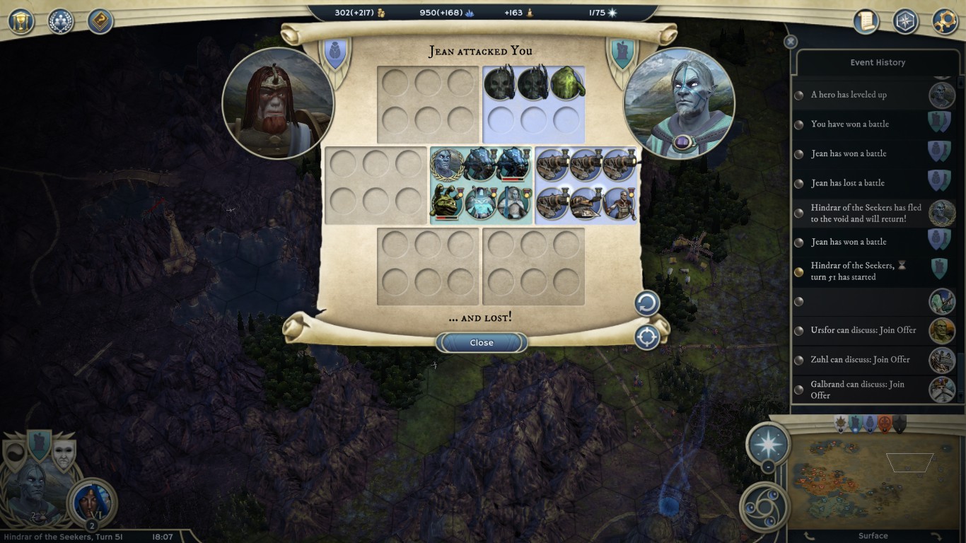 While I still had my Theo hero with a decent army, I didn't see a lot of chance, from my part, to be able to outrpoduce Jean military wise, and defeat him. He had tough home defense, he had three stacks, lead by two heroes, cruising around Marky, and he had his leader, presumably, with a good army too. The cosmic event, which prevets CP replenishment, following after the return of my leader didn't help either.