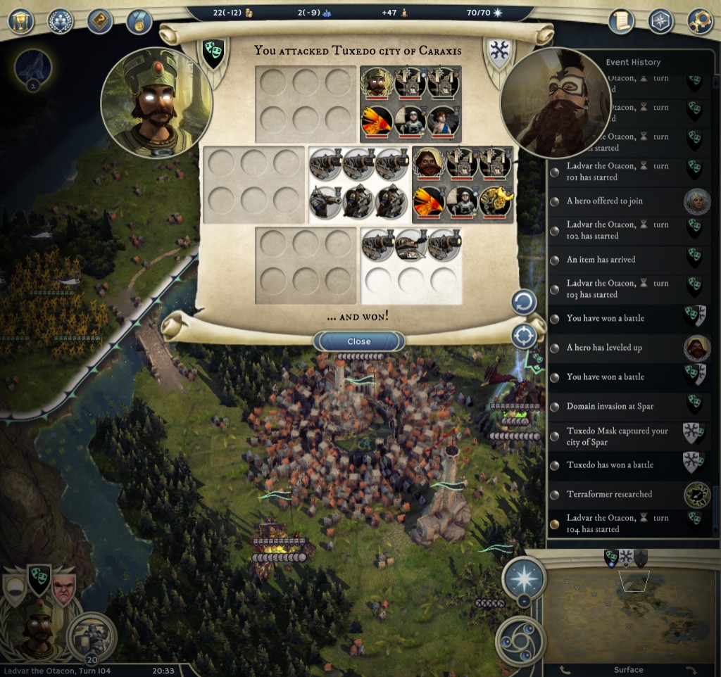 At the end, I think we both destroyed our empires, I had a city left and 3 of his, but I had no way to defeat his stack, so it was just matter of time,  my leader had some cannons a priest and a tank and they were killed (except for my leadeR) by 3 archon stacks that were on my escaping route =P.  I was just crossing my fingers to be able to kill just his leader or that he would ran out of resources, but that didn't happen.