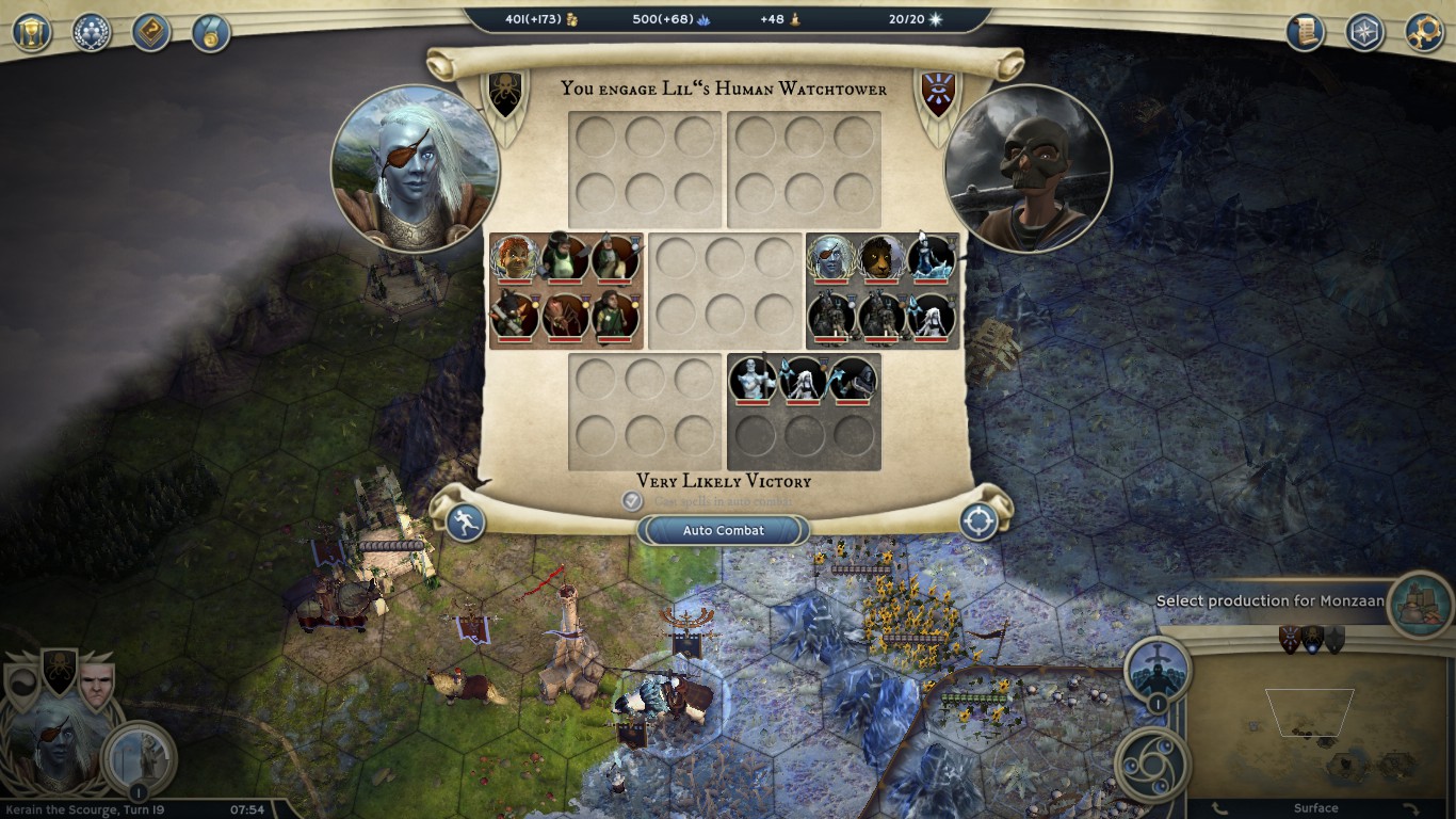 I started in the bottom right corner, and I thought I was doing decently, aside that I couldn't clear the Forge, which was defended by two T3 versions of the Fire Elemental, next to my throne (It feels like the game is hating on Frostling with that start, which always seem to be the same if there is a Forge nearby.), and my racial independants was across a small lake, more to the east, with a mountain hex in the way on the shorter route. I thought these to be minor nuisances at the time. But, I lvl-ed okeyish, didn't lose anything important, managed to find and befriend (and shortly after vassalize) a Dragon Dwelling underground, and, since I got a Frost Queen as a quest reward from my racial vassal, I thought I could take a Hall of the Forefathers around turn 14. This is considered very early for me to attempt a Legendary site.