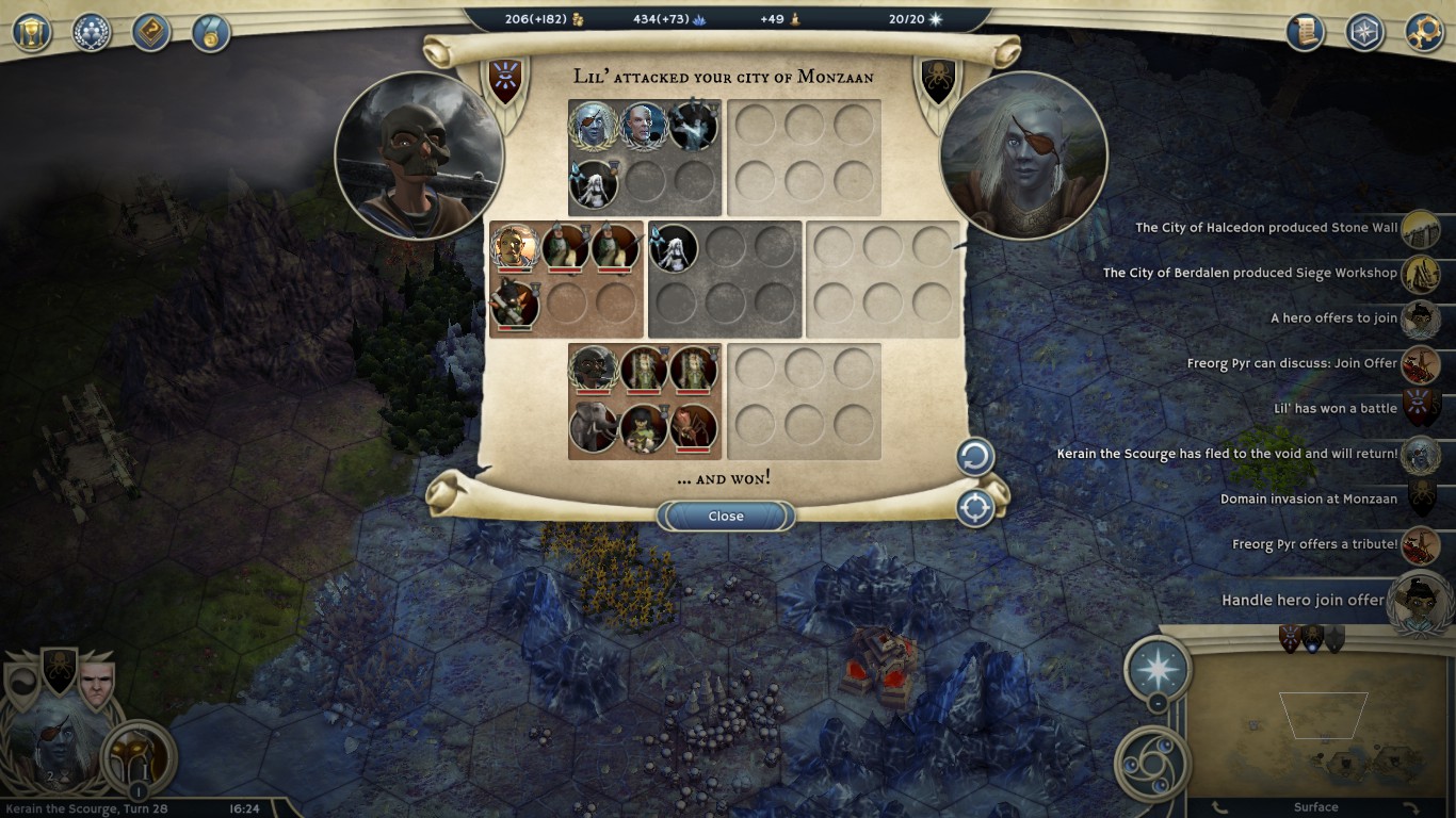 For my side of this story... I had a decent start, lost some units at the beginning and had some issues to clear some sites to the fact that I started with 2 AD... It wasn't until my 2nd hero that I got a theo...