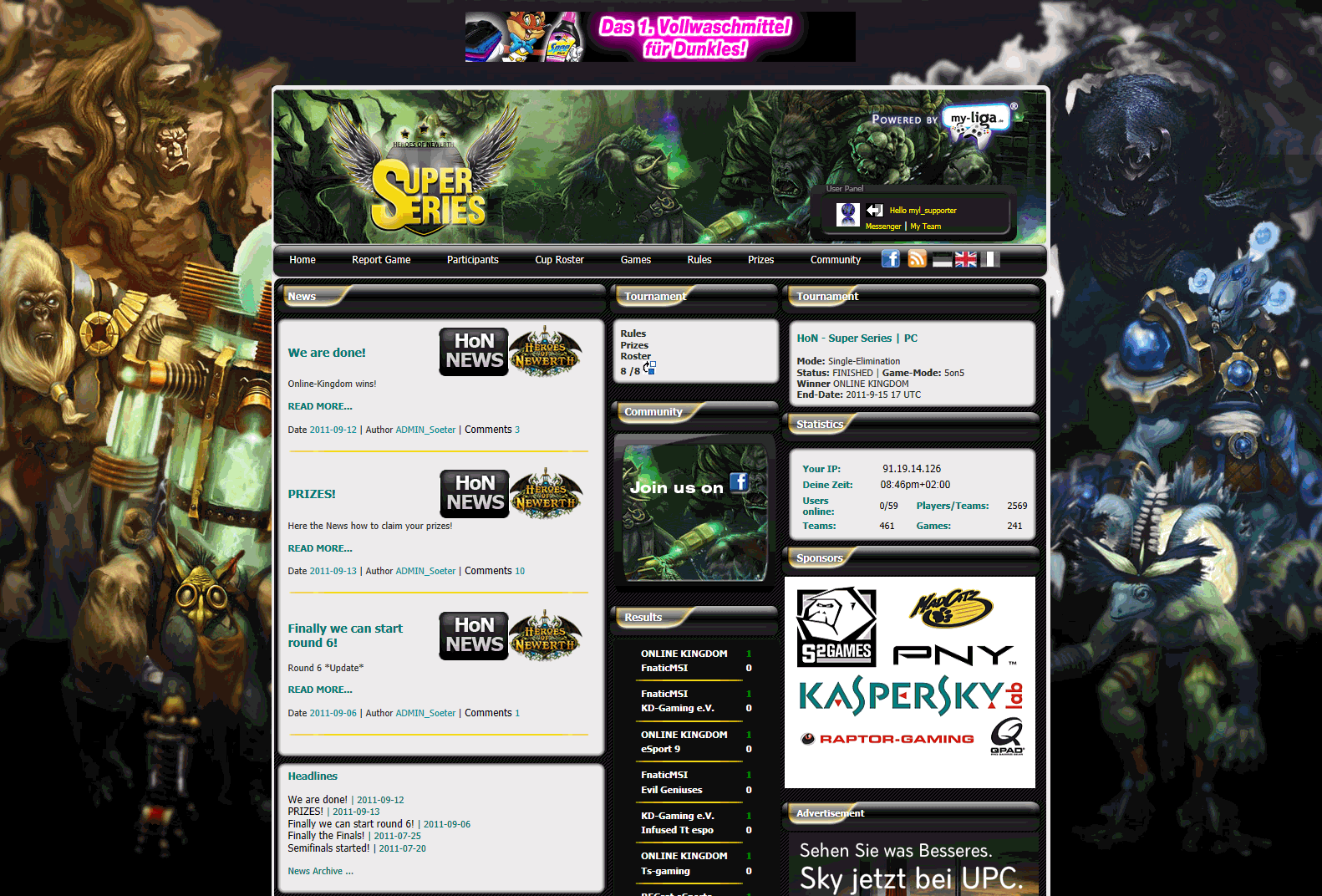 Infos sur l'événement:Heroes of Newerth Super Series avec en tout 256 équipes. Tournoi international en 8 tours (élimination directe) avec beaucoup de prix.