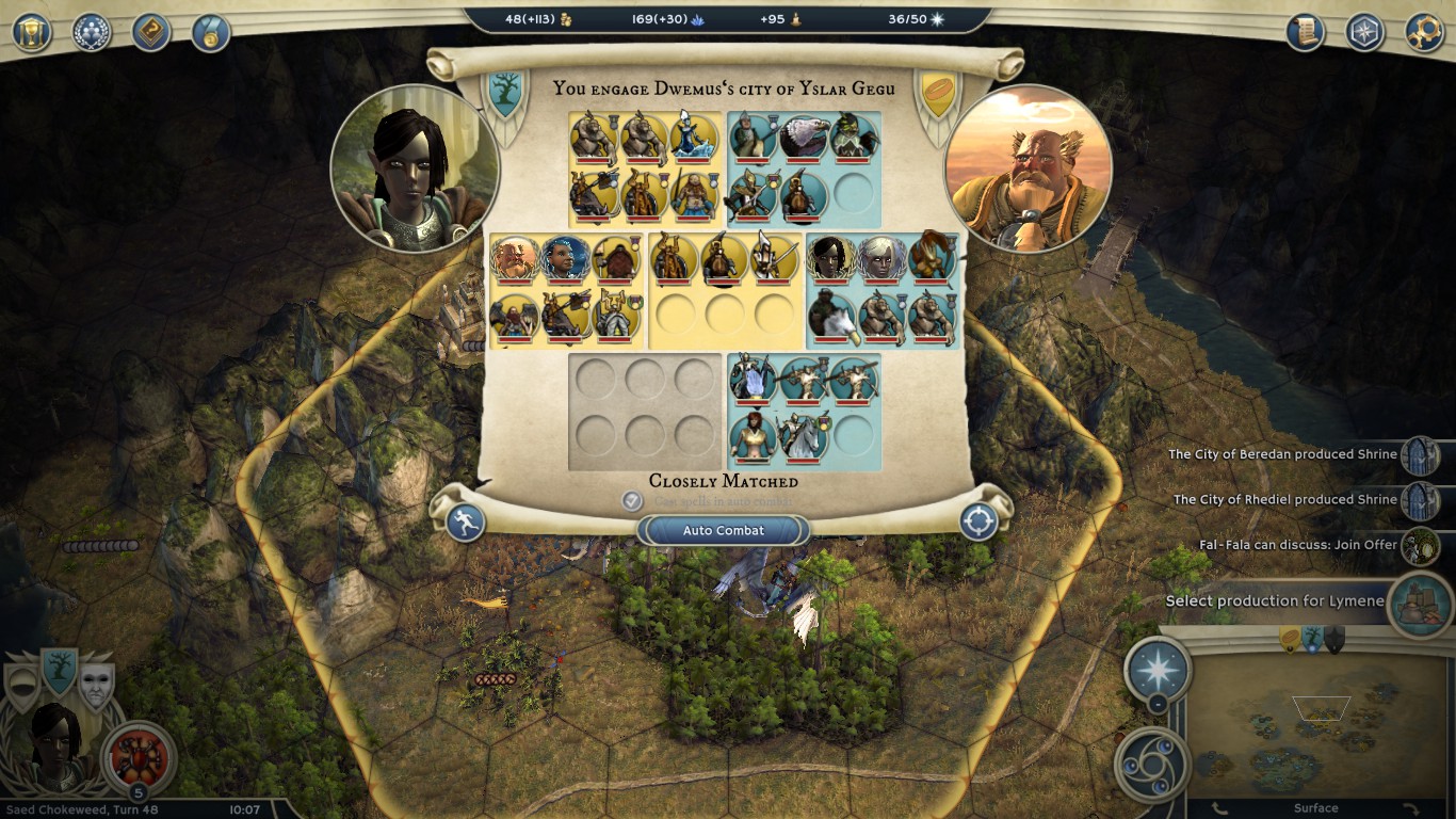 We had a major battle at turn 48 at a giant dwelling, freshly claimed by Marky. I think I managed to kind of sneak up on his main army with mine.