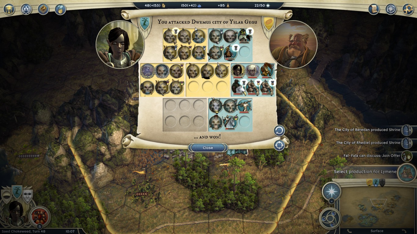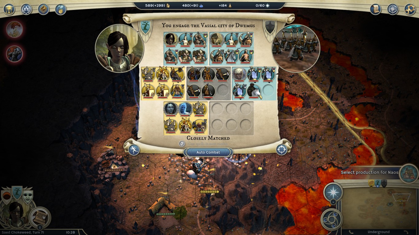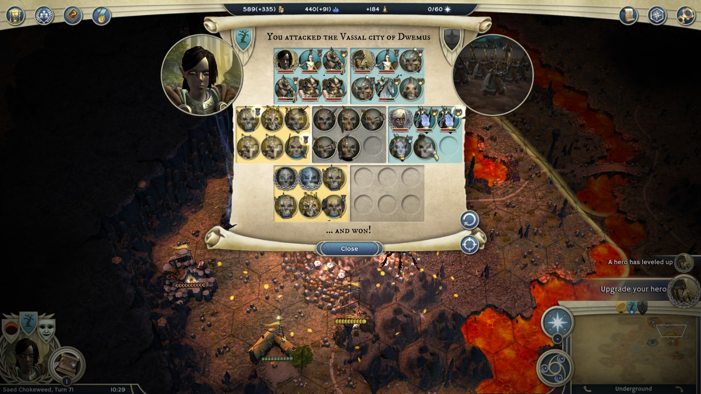 I knew he had a tough second army and hero protecting his throne so I didn't dare to go for it with what I had remaining, and my second army with my third hero was way too f ar. So we both cleared sites some more and tried to grow. Marky finished a few Empire quests while I did none so I was certain he was ahead of me economy, military and research wise. Eventually I decided to try a split attack: My sorcerer and flying units went from south to capture his underground vassals while my main forces went toward his throne city. With my main force I got stuck in a narrow 1-hex tunnel with Marky's hero where apparently none of us dared to attack the other because not all our armies would have joined. To my relief his leader was heading toward a vassal of mine on the other side of the map so I took my time to stand in the tunnel while my sorcerer slowly headed north, raizing and plundering cities on the way, until it reached the same vassal city my leader was stuck at. To this city Marky's heroes retreated and stood their final ground.