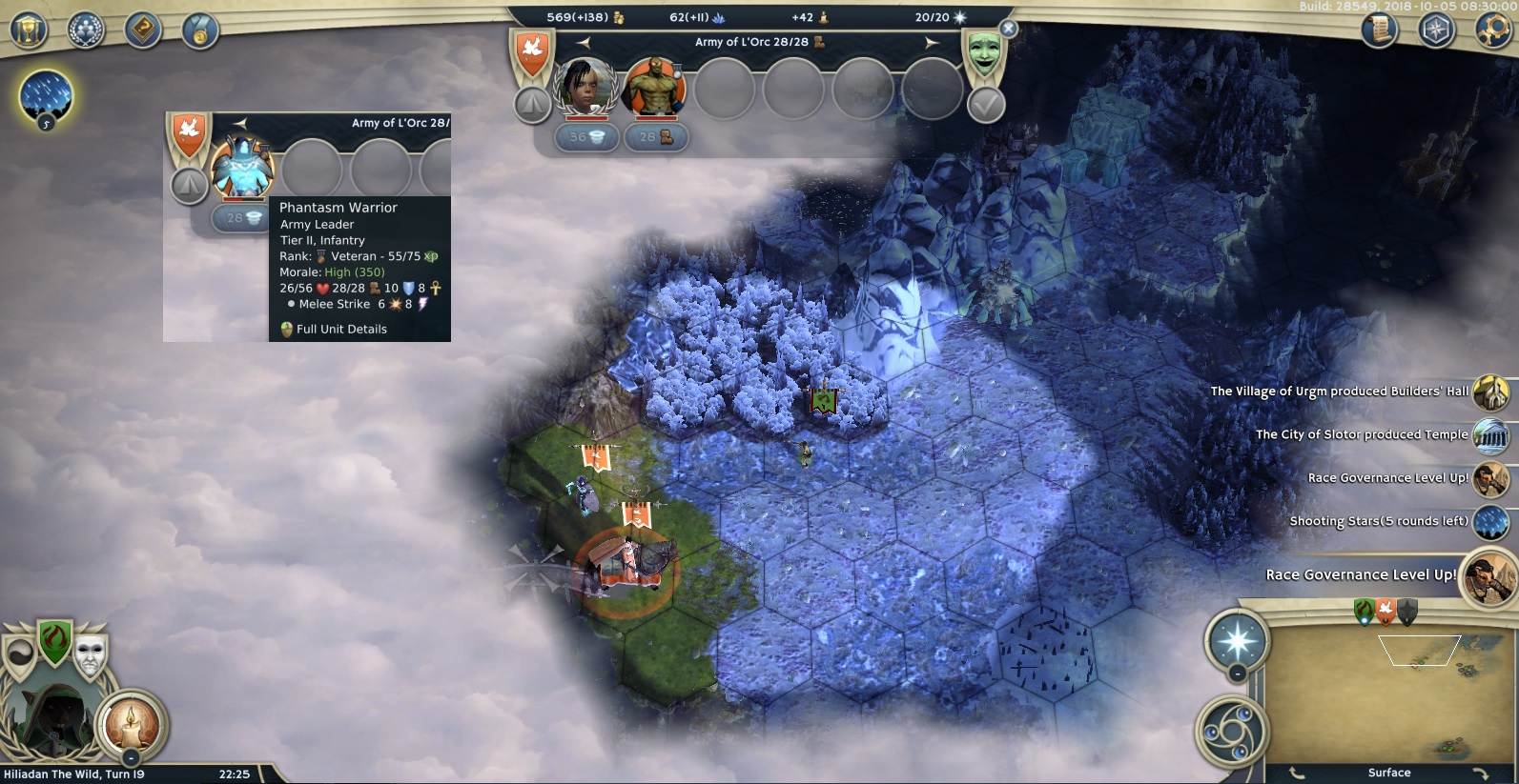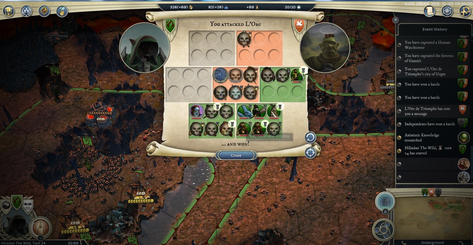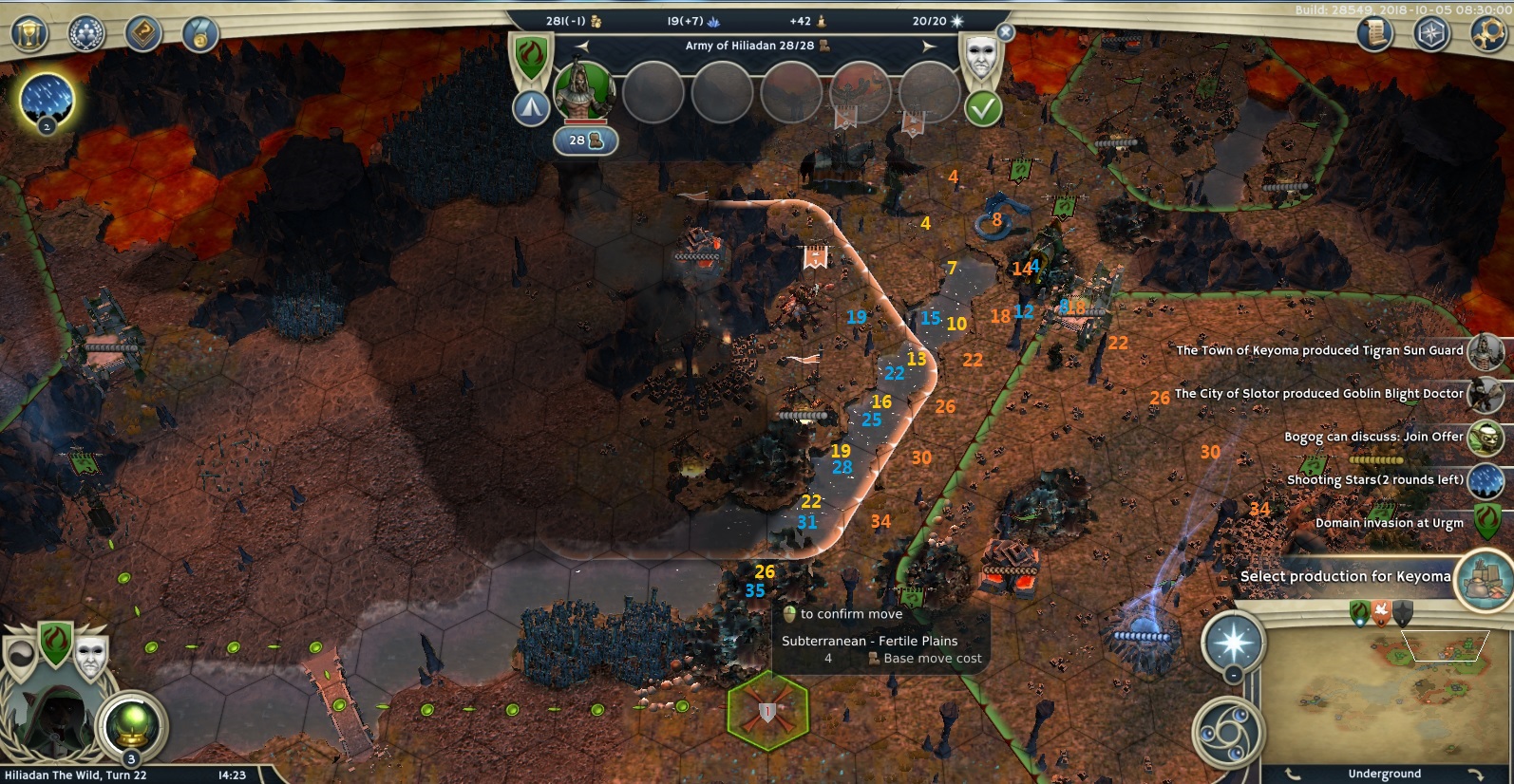 We met around turn 13 and I started killing Spirit's Cherubs which he dispatched a bit too carelessly to places where I could reach them (I was lucky to have built a Hunter just in time!). The Cherubs had appeared UG and he was playing Orc so I was really unsure where he had started: UG or surface? I thought UG so I tried to send troops there to find him. He had vassaled a Fey Dwelling and then later on a Giant Dwelling UG, so I was reinforced in my belief that he was there.