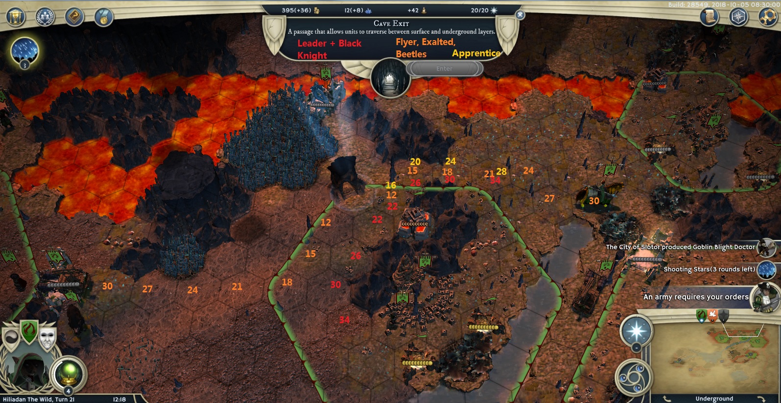 This is the surface situation: the Hunter I had sent to find Spirit found a Cave Entrance and emerged just near his undefended Fortress which he took and destroyed on turn 22 a nd then positioned himself on Forest (concealed) at strike range of his Throne. I had researched Long Strider (to try to get the upkeep reducing Empire Upgrades, but of course it's also great to get +8 MP!!! especially on Darters and Blight Doctors and not just Hunters) so I moved a lot. You can also see where my Leader as: south-west surface.