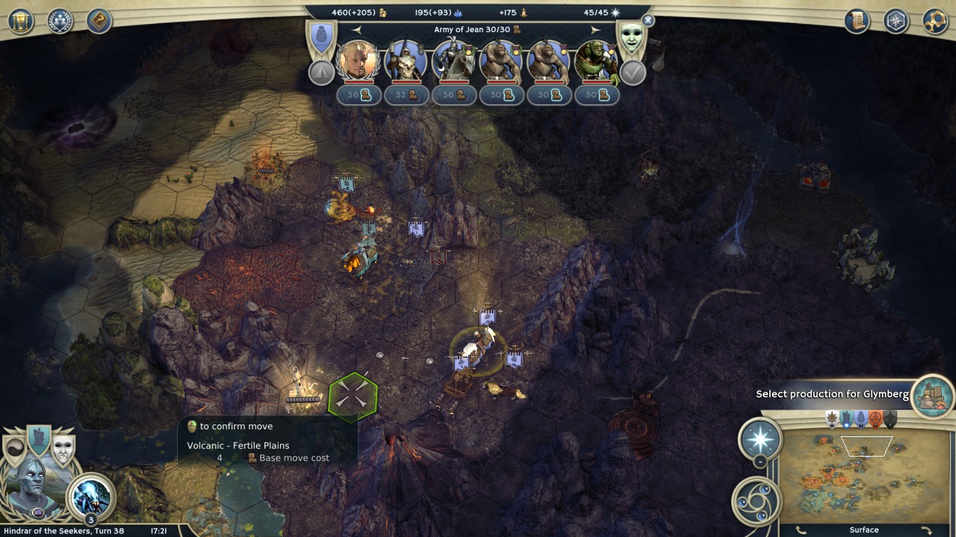 The first half of the game was quiet, aside the ocassional scouts. I crossed the waters with my leader army and cleared some easier sites southwest from Jean's domain. He also had a Giant dwelling. Originally I wanted to try to take it but I didn't like my chances against the 6 Ogre defenders (maybe there was some more standing a hex away) in autocombat (DrLight's pesky crow was there), especially since my plan was to attack Jean's cities afterward, and I didn't want to lose units. In retrospec I should have attacked the dwelling then because later it just became too strong, and Jean got too many Ogres and even a Giant from it.
