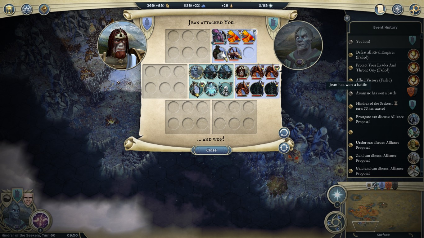 I started to build Ice Queens to have something(!). In the meantime Jean's three stacks, after destroying Marky's vassal in the north, set sail instead of attacking Marky. It occured to me that he might be coming for me. Which he did, eventually after taking a scenic route. I didn't see the point of trying to return my Theo for defence, instead I did some quests underground for my Vassals, after getting back my Orc vassal from DrLight.
