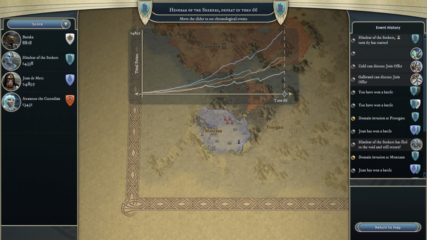 Instead I split my armies, because I got Invisibility on my leader, so tried to see if I can scoop in and take a few cities. Unfortunately for me, Jean had a surprisingly good defending army (lvl-ed Cannons, Engineers, and some Priests), and it could reach most of his cities within two turns. I could only take one of his newer and smaller cities. At this point I had a couple of Eldritch Horrors, and were to summon more, but Jean kept "draining" my leader's CPs off turn. While we were playing hide and seek, and CP management games he got some Obsidian Dragons out of the blue. I was certain I dealt with any support that could see my invisible army as I was making my way out, but I was wrong.