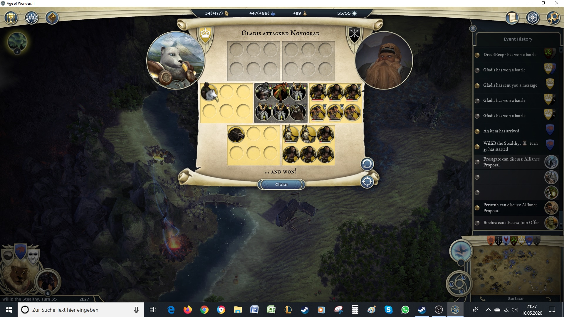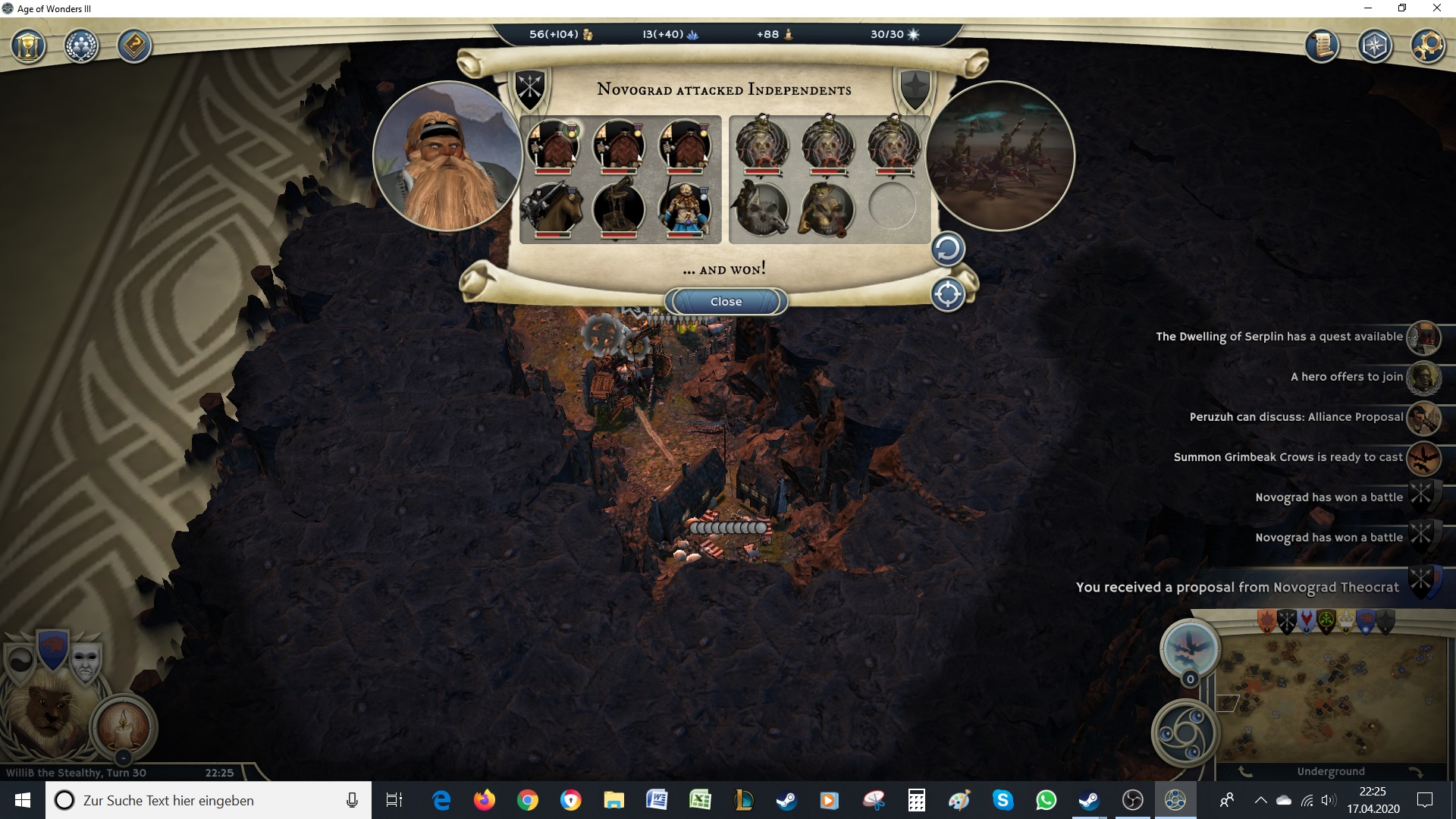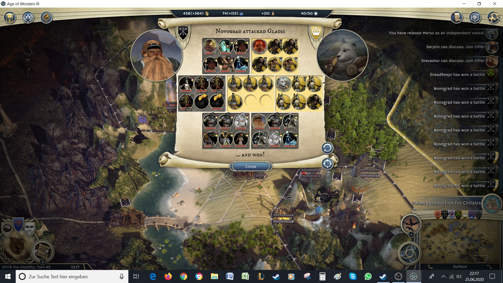 I was able to get rid of this stack with the help of my vasall and have had the control of the center map with my crows and wyverns from that time on. After my shitty start my job was scouting for Novo and Dread and imo I did that quite well. We always knew where the main armys of our enemys were and could expand save and without fearing and invasion. Btw, where did that rougue stack went I've seen in the center UG some turns ago? I've never found it again...