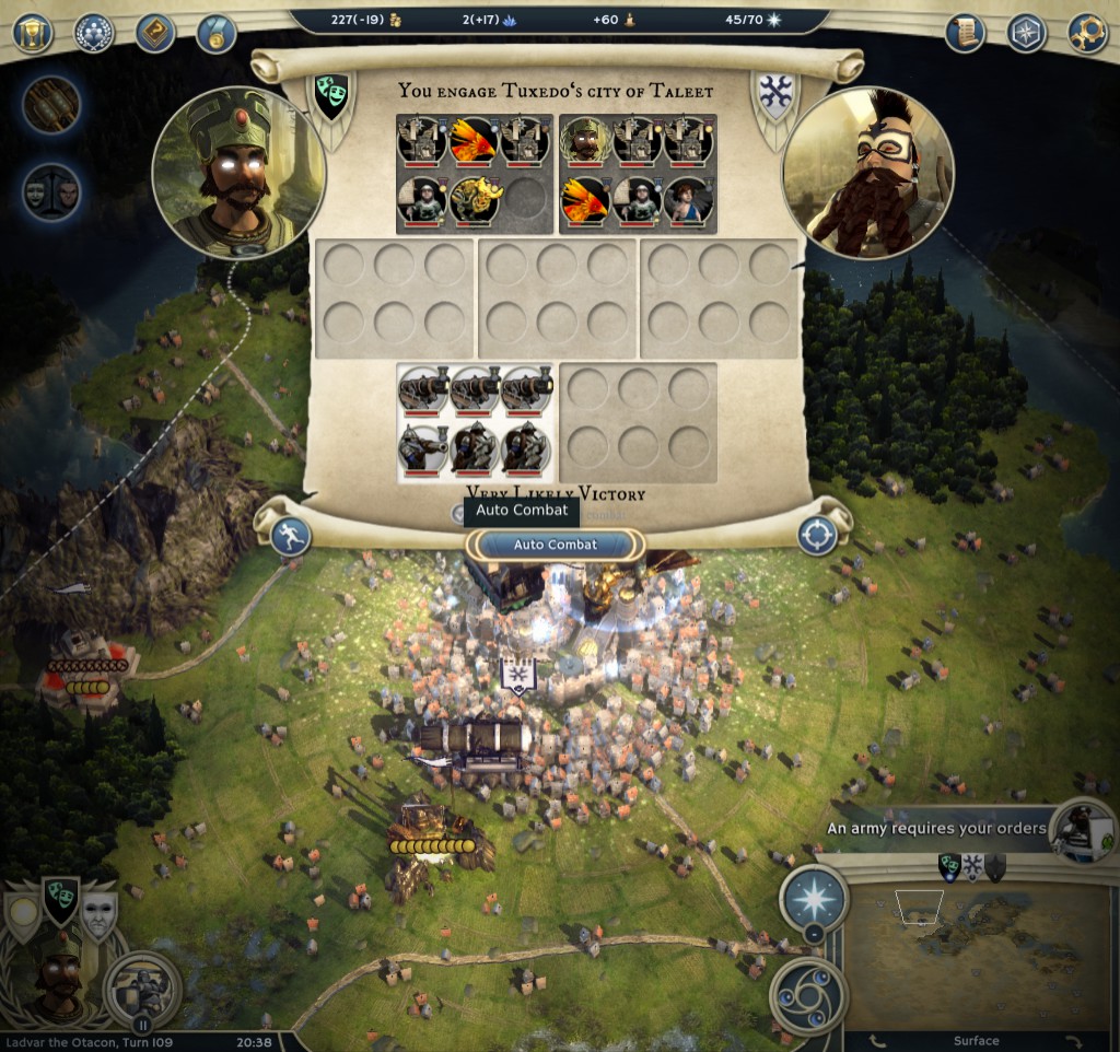 At turn 25? I had roughly 4 stacks and I caught Dr leader alone with his leader and a settler building a city. I defeated that and I saw a hero coming in with a stack. I then decided to attack a hard-edged strike force of two knights and a strong leader. I then lost my leader and a hero stack.