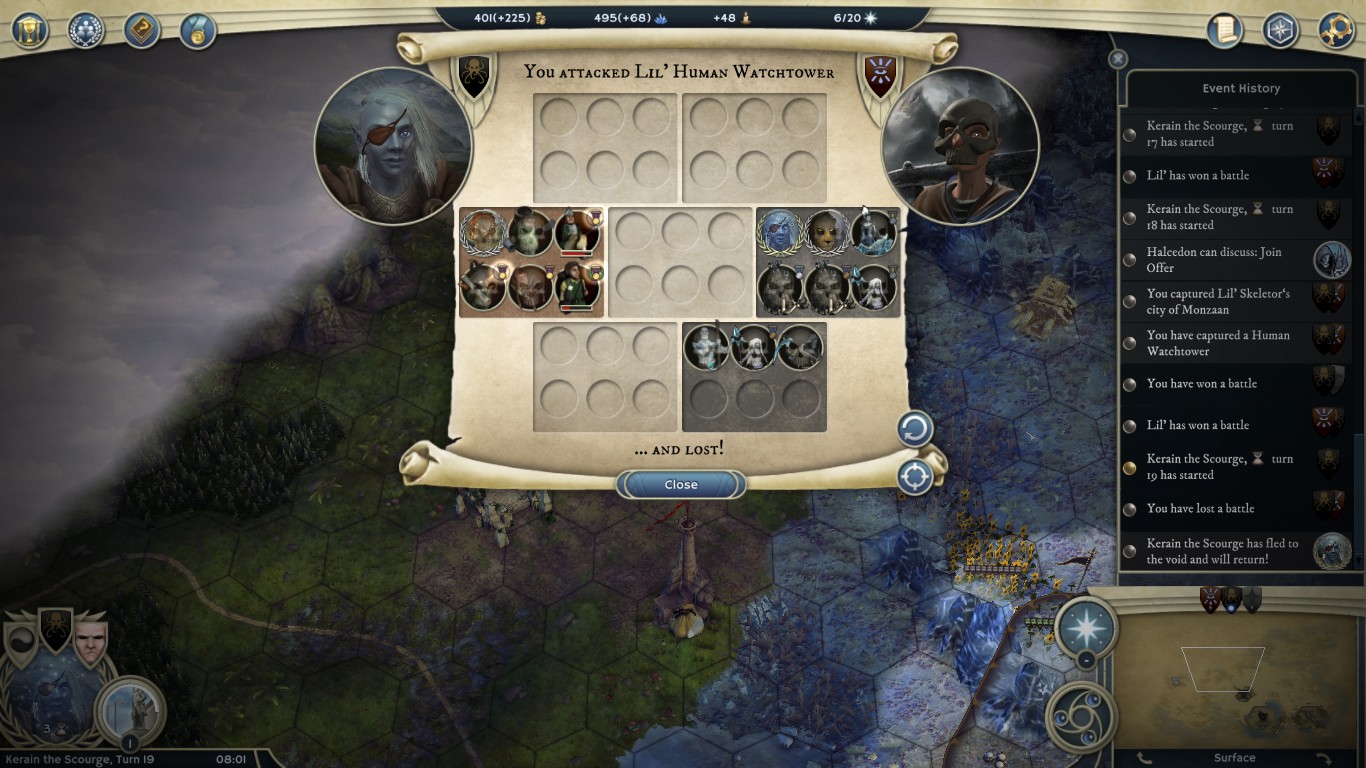After my leader returned, I noticed a tavern that was very close to his main, but before getting there there was an undead boneyard, which I tried to take and killed my leader again... Which was annoying because I couldn't cast eldritch animal for like 6 turns! Then again, I was feeling fear again, so I knew I had to keep control of the front flank and keep him busy so he wouldn't flank me and attack my again defenseless main city...