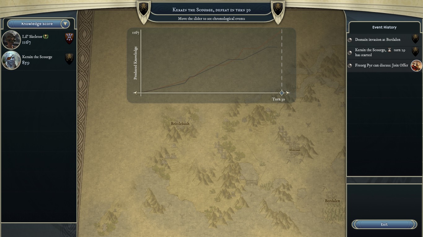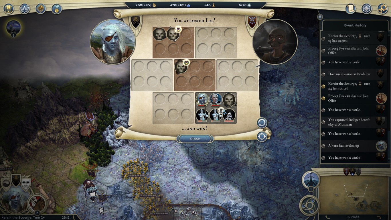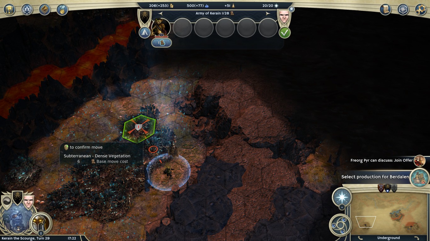 I started in the bottom right corner, and I thought I was doing decently, aside that I couldn't clear the Forge, which was defended by two T3 versions of the Fire Elemental, next to my throne (It feels like the game is hating on Frostling with that start, which always seem to be the same if there is a Forge nearby.), and my racial independants was across a small lake, more to the east, with a mountain hex in the way on the shorter route. I thought these to be minor nuisances at the time. But, I lvl-ed okeyish, didn't lose anything important, managed to find and befriend (and shortly after vassalize) a Dragon Dwelling underground, and, since I got a Frost Queen as a quest reward from my racial vassal, I thought I could take a Hall of the Forefathers around turn 14. This is considered very early for me to attempt a Legendary site.